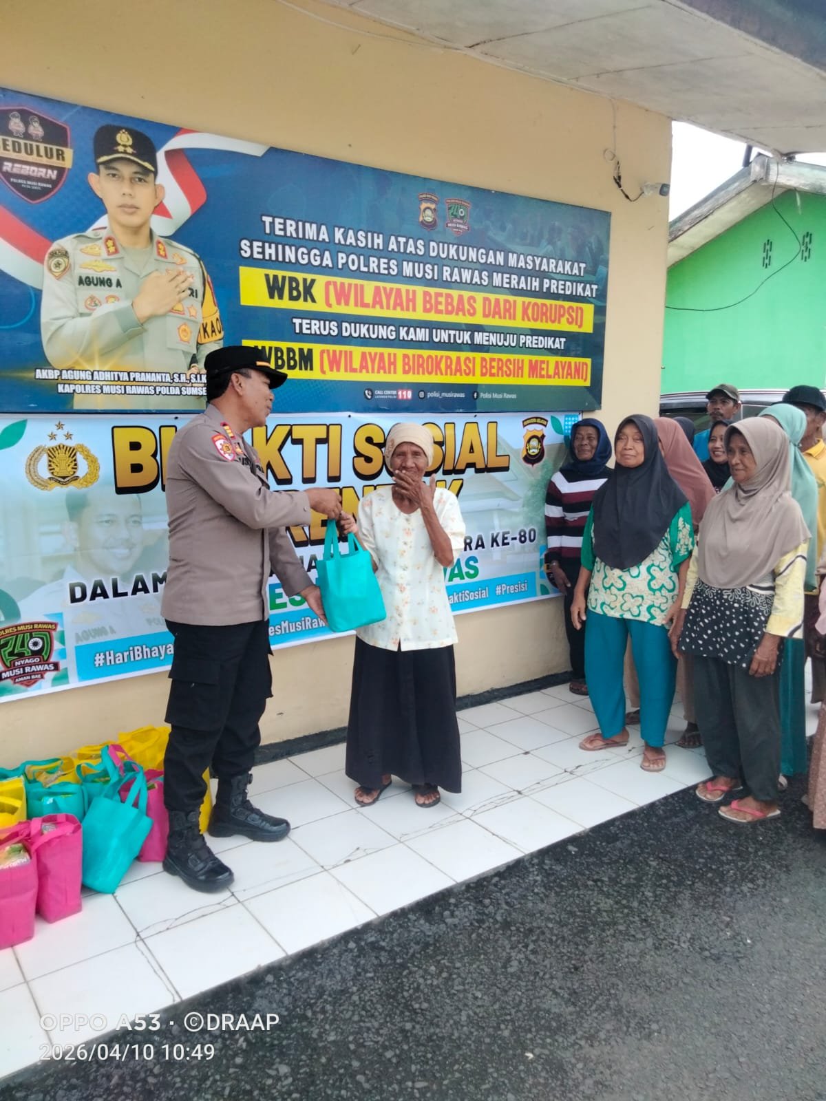 Musi Rawas Tugumulyo – Dalam rangka memperingati Hari Bhayangkara ke-80, Polres Musi Rawas melalui Polsek Tugumulyo menggelar kegiatan bakti sosial serentak dengan membagikan ratusan paket sembako kepada masyarakat yang membutuhkan, Jumat ( 10 April 2026 ).