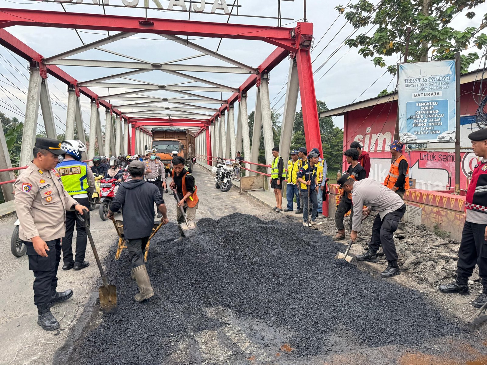 Kapolres OKI bersama unsur Kodim 0402, Dinas PUPR, Satpol PP, dan Dinas Kebersihan OKI melaksanakan penambalan jalan menggunakan aspal curah serta mesin pengeras aspal.