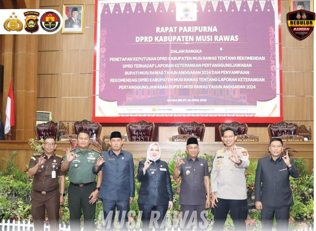 Kapolres Musi Rawas (Mura), AKBP Agung Adhitya Prananta SH, SIK, MH, menghadiri Rapat Paripurna DPRD Kabupaten Mura, di Ruang Rapat Paripurna, Pusat Perkantoran Agropolitan Center Pemkab Mura, Senin (28/4/2025).