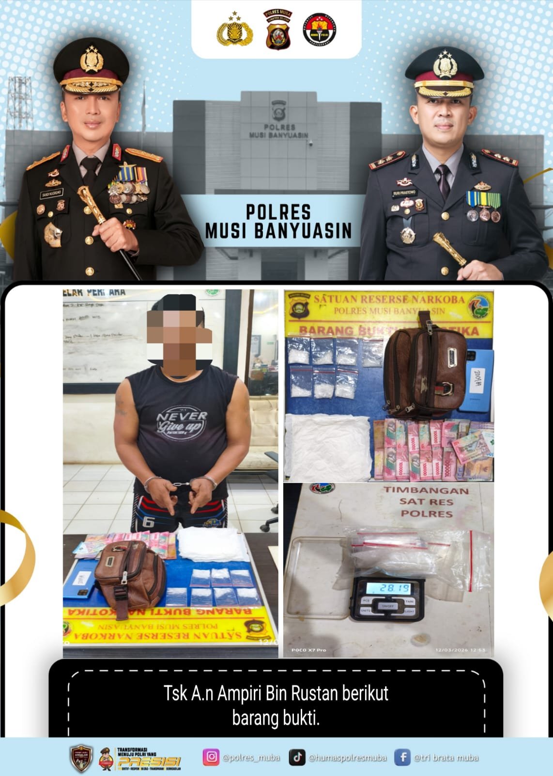 MUSI BANYUASIN — Menjelang pelaksanaan Operasi Ketupat Musi 2026, Satuan Reserse Narkoba Polres Musi Banyuasin menangkap dua pengedar narkotika jenis sabu dalam dua operasi terpisah di wilayah Kabupaten Musi Banyuasin.