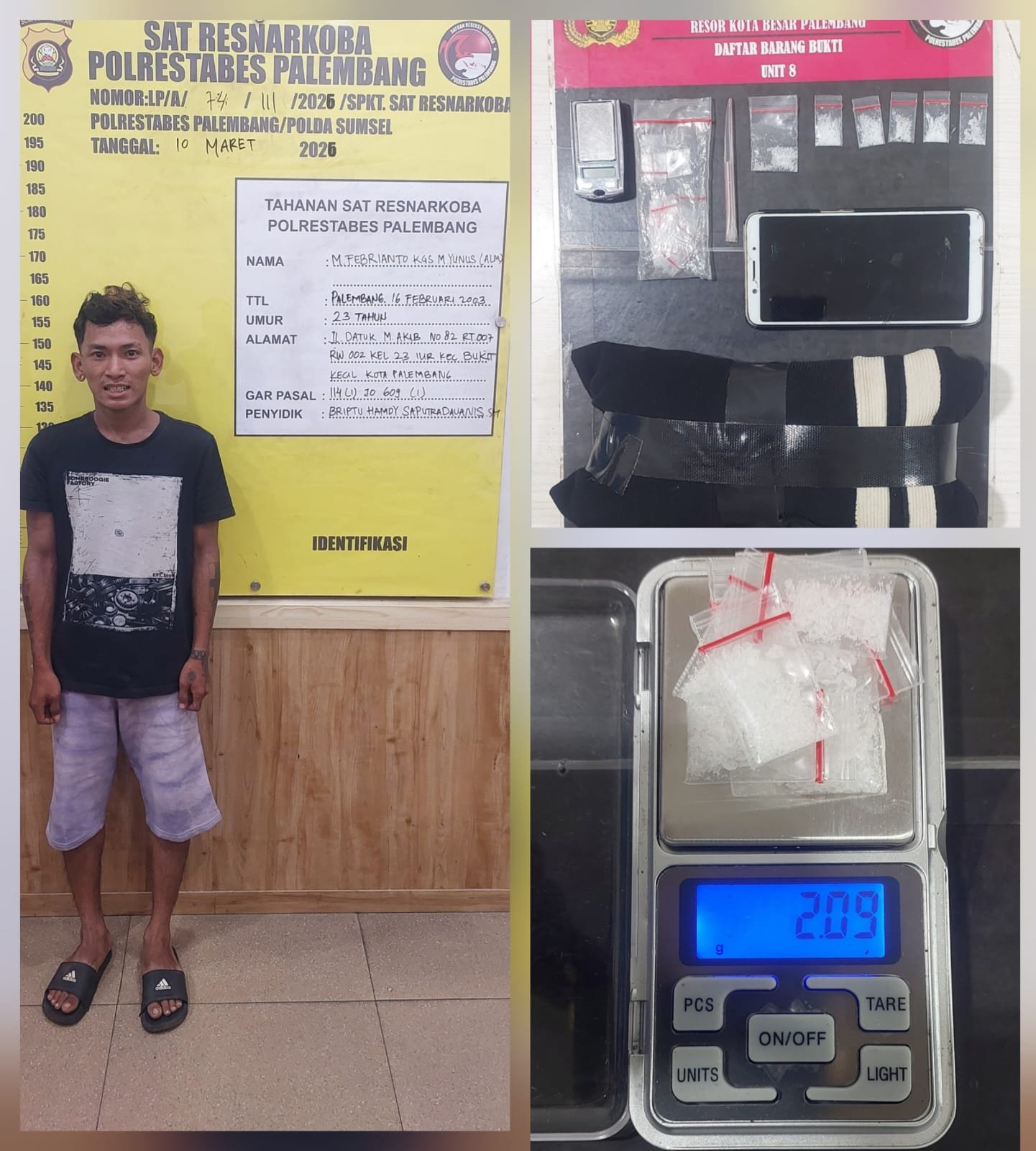 Tersangka pertama berinisial MF (23), seorang buruh harian lepas, ditangkap pada Selasa malam (10/3/2026) sekitar pukul 21.30 WIB di kawasan Lorong Cempaka Kuning, Kelurahan 26 Ilir, Kecamatan Bukit Kecil.