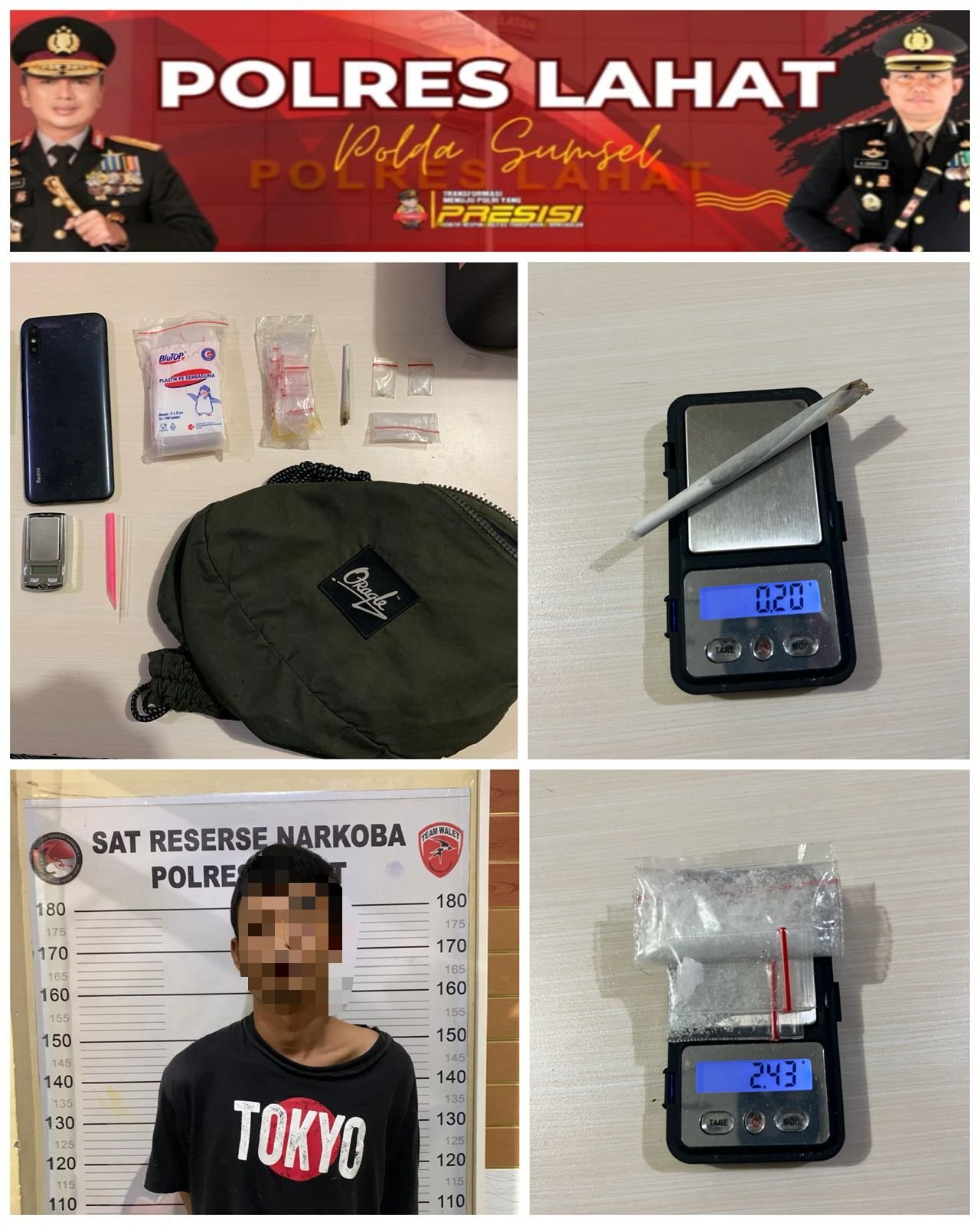 Seorang tersangka berinisial SM (23), warga Kecamatan Lahat, diamankan di lokasi. Dari hasil penggeledahan, petugas menemukan narkotika jenis sabu dan ganja yang disimpan di beberapa titik berbeda di dalam kontrakan.