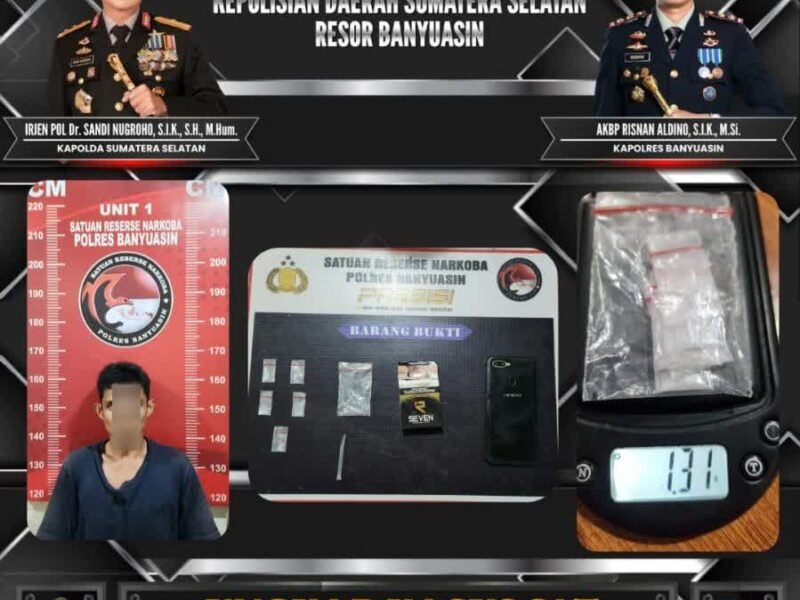 Banyuasin — Satuan Reserse Narkoba Polres Banyuasin kembali menunjukkan konsistensi dalam pemberantasan narkotika dengan mengungkap kasus kelima dalam satu pekan. Petugas membekuk seorang tersangka pengedar sabu dalam operasi tangkap tangan di Desa Taja Mulya, Kecamatan Betung, Kabupaten Banyuasin, pada Rabu, 8 April 2026, sekira pukul 21.30 WIB.