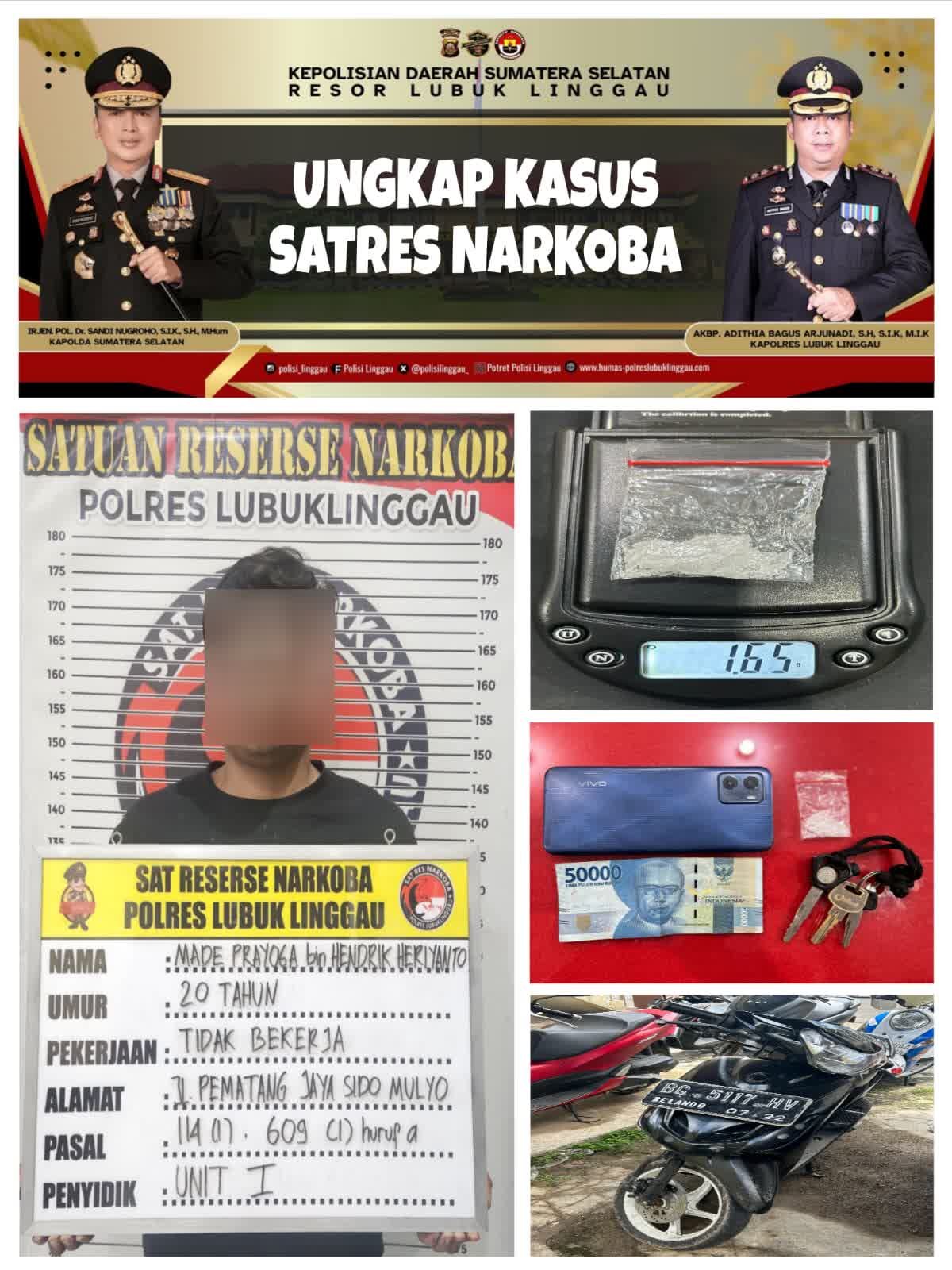 Barang bukti yang diamankan meliputi satu paket sabu seberat 1,65 gram, satu unit telepon genggam merek Vivo Y15S warna biru, satu unit sepeda motor Yamaha Mio warna hitam nomor polisi BG 5117 HV, serta uang tunai Rp50.000. Seluruh barang bukti dan tersangka kemudian dibawa ke Polres Lubuk Linggau untuk proses penyidikan lebih lanjut.