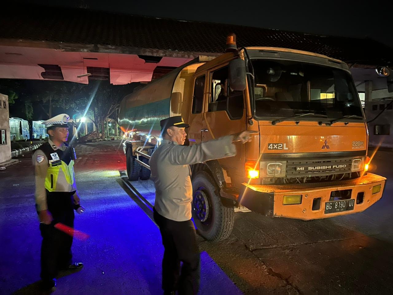Petugas melakukan pengaturan lalu lintas secara dinamis serta memberikan imbauan kepada pengemudi terkait keselamatan berkendara dan kepatuhan terhadap aturan tonase kendaraan.