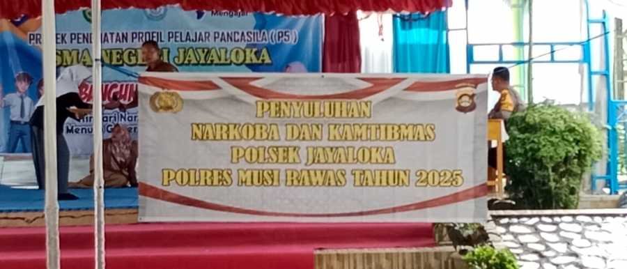 Polsek Jayaloka Polres Musi Rawas (Mura), menggelar sosialisasi pencegahan penyalagunaan narkoba, anti kekerasan dan pencegahan judol di SMA Negeri Jayaloka, di Kecamatan Jayaloka, Kabupaten Mura, Selasa (11/2/2025).