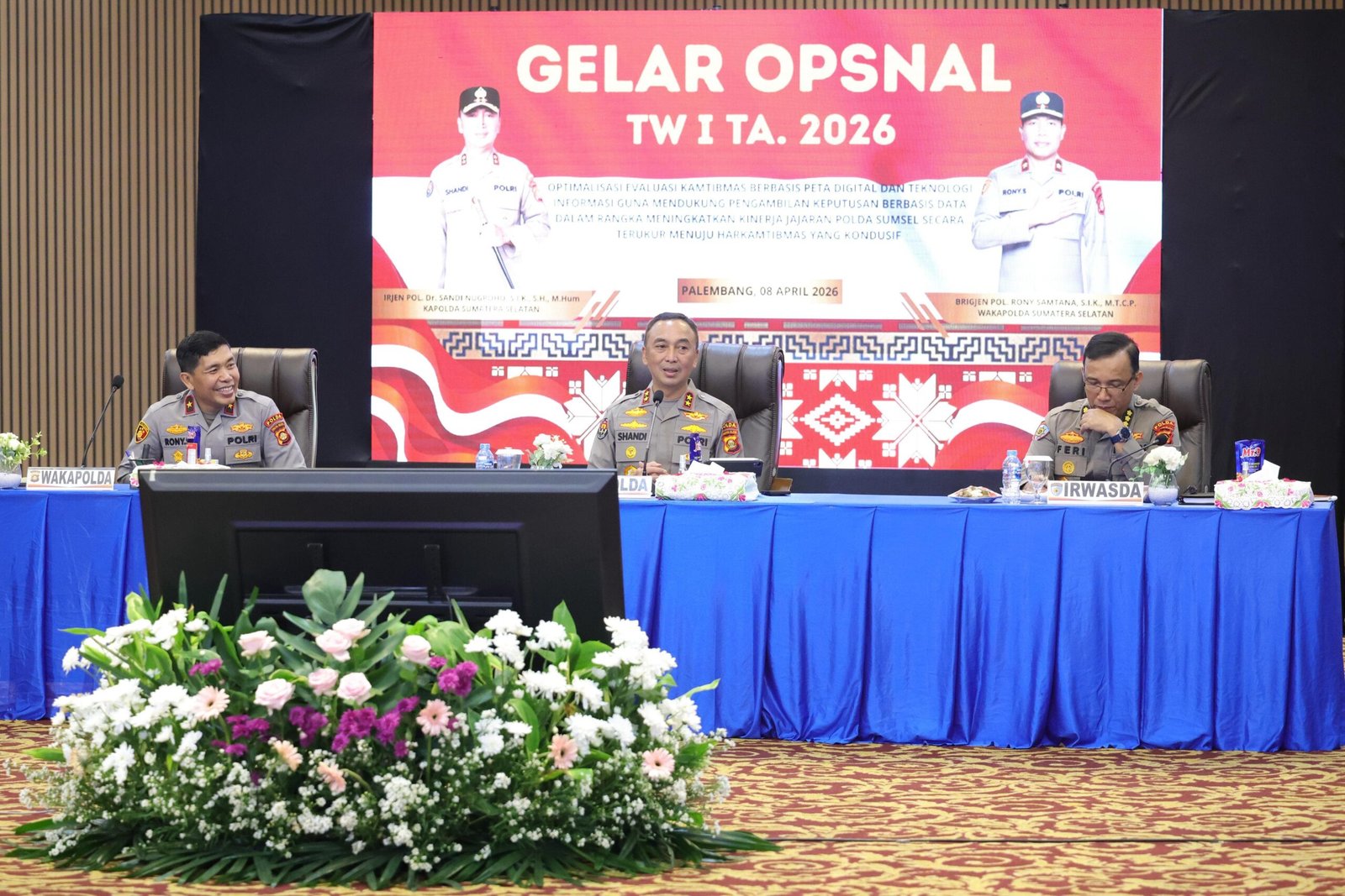 PALEMBANG — Polda Sumatera Selatan melaksanakan evaluasi kinerja secara terbuka melalui Gelar Operasional Triwulan I Tahun Anggaran 2026 yang dipimpin langsung oleh Kapolda Sumsel Sandi Nugroho di Gedung Presisi Mapolda Sumsel, Rabu (8/4/2026).