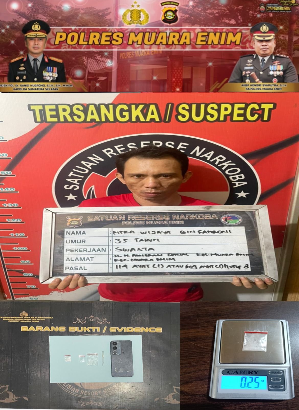 Operasi ketiga berlangsung sekitar pukul 10.15 WIB di kawasan Kelurahan Pasar II, Kecamatan Muara Enim. Petugas mengamankan tersangka FW (35) di dalam kamar kontrakan. Dari hasil penggeledahan, ditemukan satu paket sabu seberat bruto 0,25 gram, dua plastik klip bening, satu pipet berbentuk sekop, serta satu unit telepon genggam.