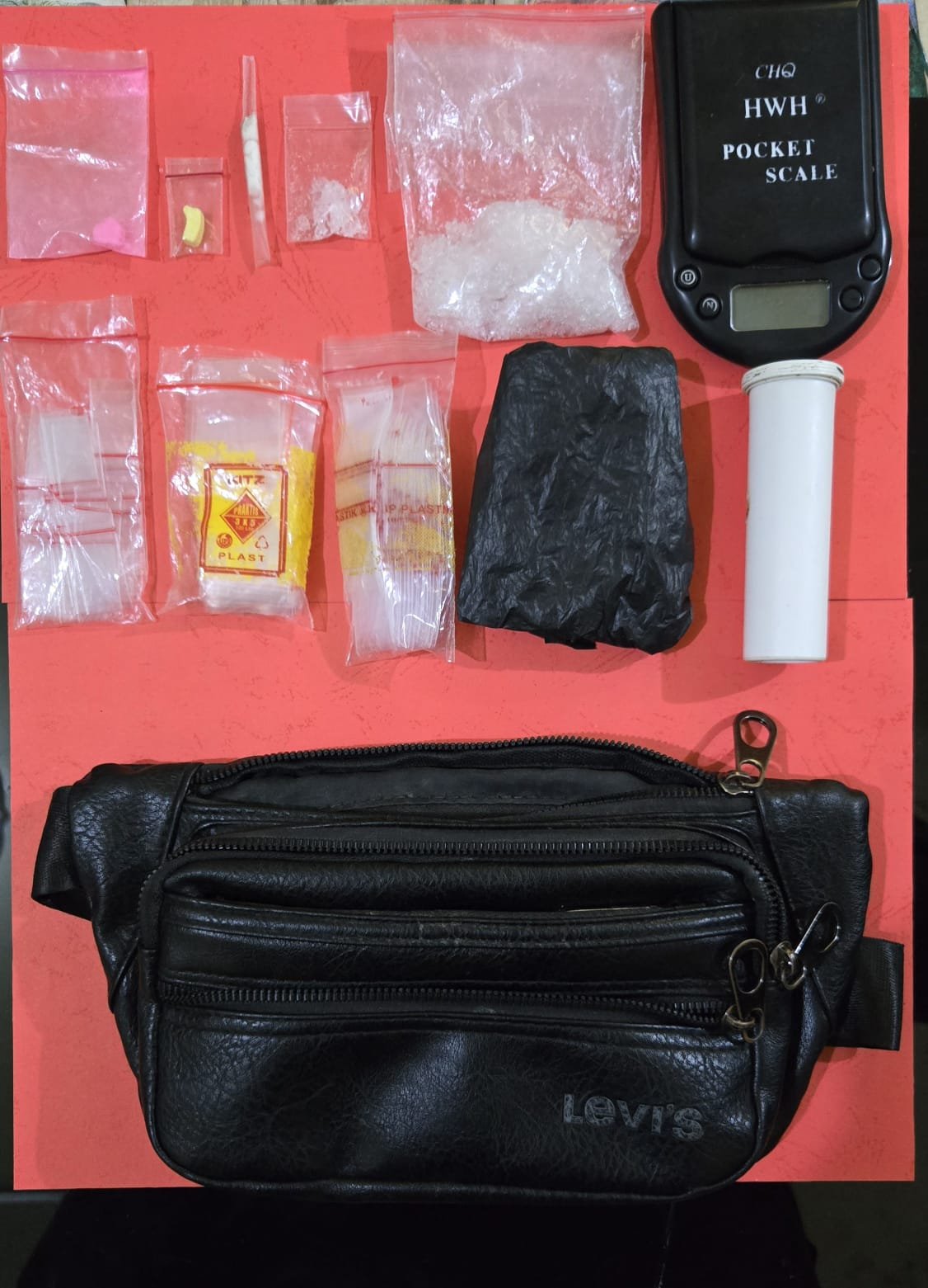 Dari hasil penggeledahan, petugas menemukan sejumlah barang bukti, antara lain:,2 bungkus plastik klip transparan berisi kristal putih diduga sabu seberat 27,82 gram,1 bungkus plastik klip berisi pil warna pink berlogo mahkota diduga ekstasi seberat 0,84 gram,1 bungkus plastik klip berisi pil warna kuning tanpa logo diduga ekstasi seberat 0,49 gram,1 unit timbangan digital merk Pocket Scale,3 bal plastik klip transparan kosong,1 botol plastik putih,1 kantong plastik warna hitam,1 buah pipet yang dipotong miring (skop),1 tas sandang warna hitam merk Levis
