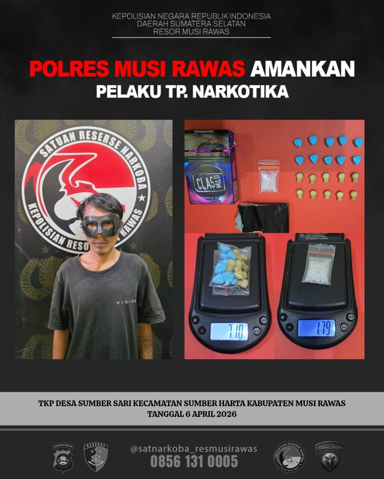 Tim Tindak Elang Musi Satresnarkoba berhasil membekuk tersangka berinisial SW (31) pada Senin malam, 6 April 2026, sekira pukul 21.30 WIB di Jalan Fatmawati, Dusun I, Desa Sumber Jaya, Kecamatan Sumber Harta. Tersangka diamankan bersama barang bukti sabu dan 20 butir ekstasi dua varian yang disembunyikan dalam kotak rokok berlakban hitam.
