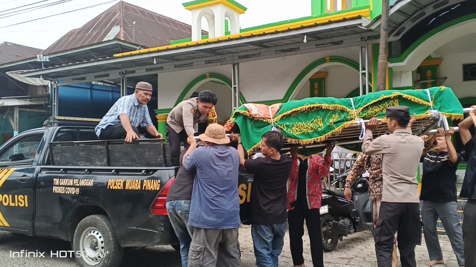 Pelayanan pengantaran jenazah dilaksanakan pada Rabu, 8 April 2026, mulai pukul 09.00 WIB, dari Desa Muara Pinang Baru menuju Tempat Pemakaman Umum (TPU) Air Kuta, Kecamatan Muara Pinang. Personel Polsek Muara Pinang menggunakan mobil patroli untuk membantu keluarga almarhum Kemas Nasir bin Muksin yang membutuhkan sarana transportasi.